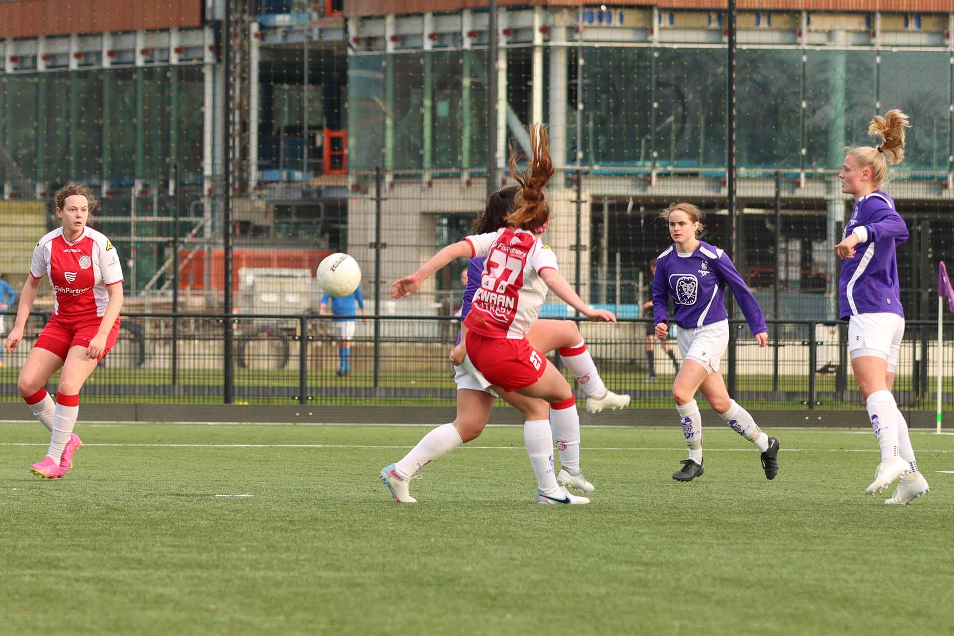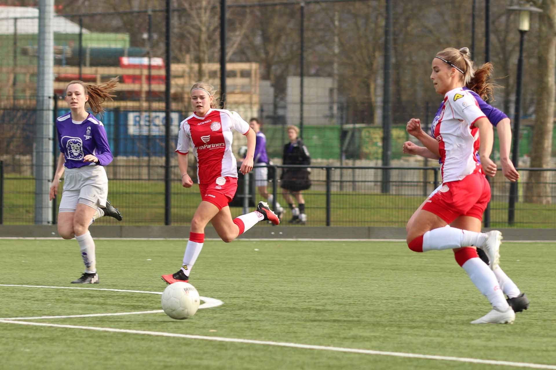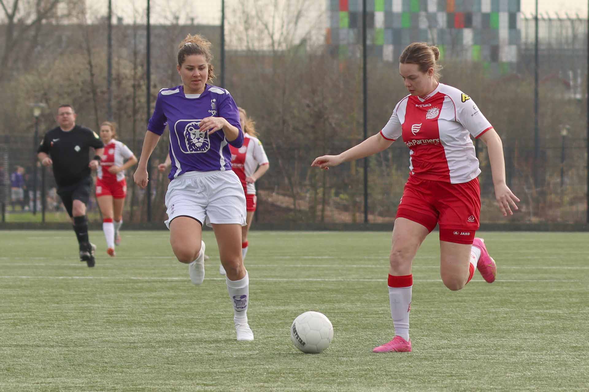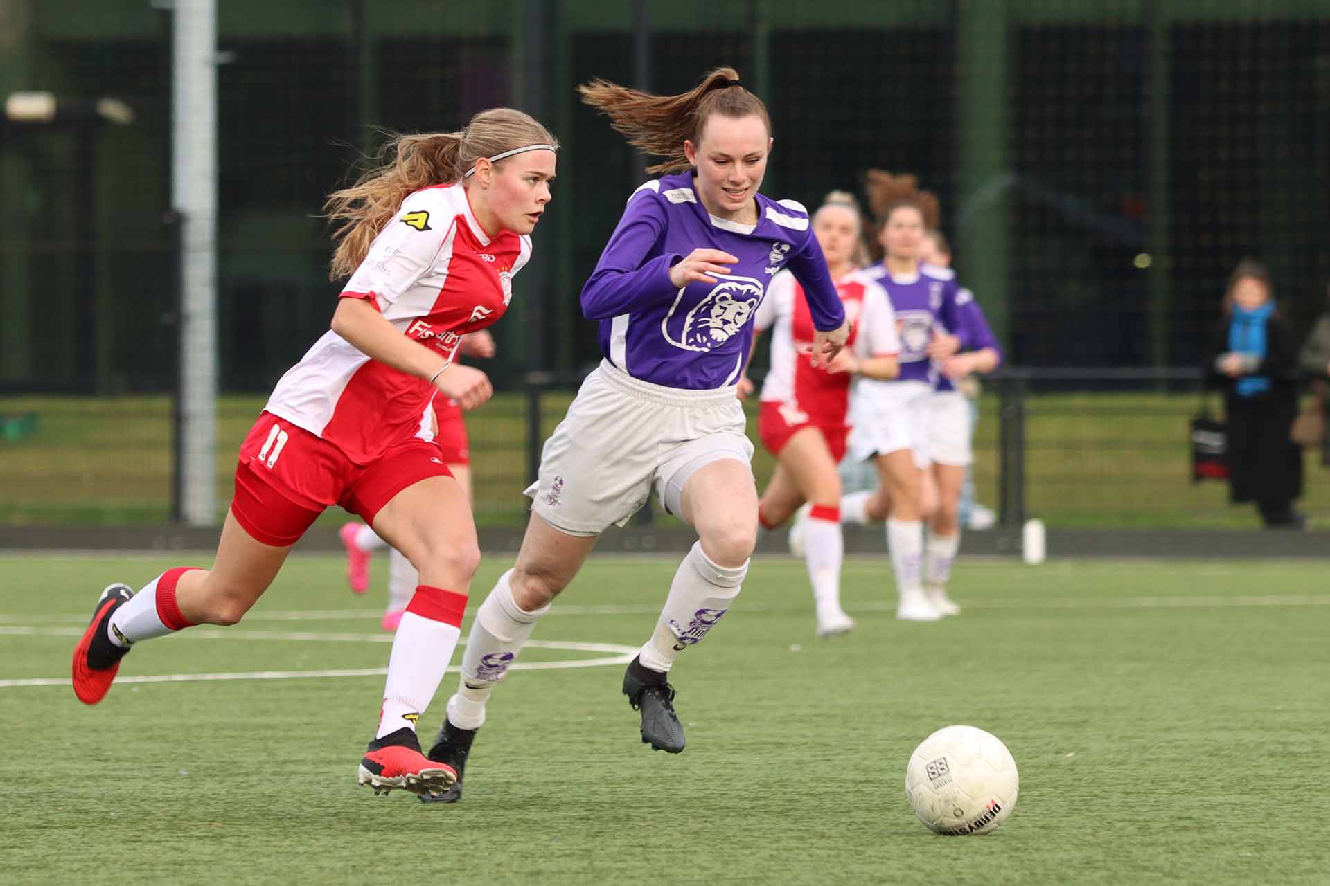 De paars-witten gaven zich niet zomaar gewonnen en zetten aan. Het tempo werd nog hoger en de Vogels-defensie kraakte toen er eerst over werd gekopt. Jonne Odding had een supersave van heel dichtbij en herhaalde drie minuten later van nóg dichterbij dat kunstje. Twee keer door het oog van de naald. In de 39e minuut was iedereen verbaasd dat de goed leidende scheidsrechter een penalty zag in een 'onschuldig' duel. Helaas werd deze benut en stond de 1-2 op het bord. Nadia en Lotte Meester zijn voor rust nog dichtbij maar scoren net niet.