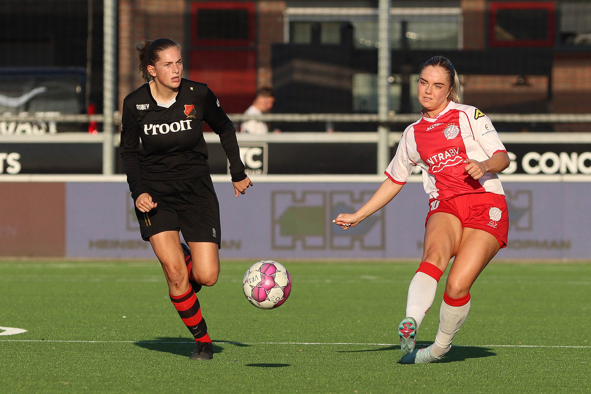 De wedstrijd begon moeizaam, beide teams maakten met veel strijd elkaar het leven zuur. Pas in de 11e minuut viel het eerste gevaar te noteren toen Lotte Meester over de rechterkant Emma van Eeken wegstuurde. Emma legde terug op de inkomende Lieke Guliker, maar die raakte de bal net niet helemaal lekker. Een kleine tien minuten later was het opnieuw Lotte met een heerlijke opening waardoor Naomi Vermeer weg was. Naomi strandde echter in het zicht van de keeper door de bal te ver voor zich uit te spelen.