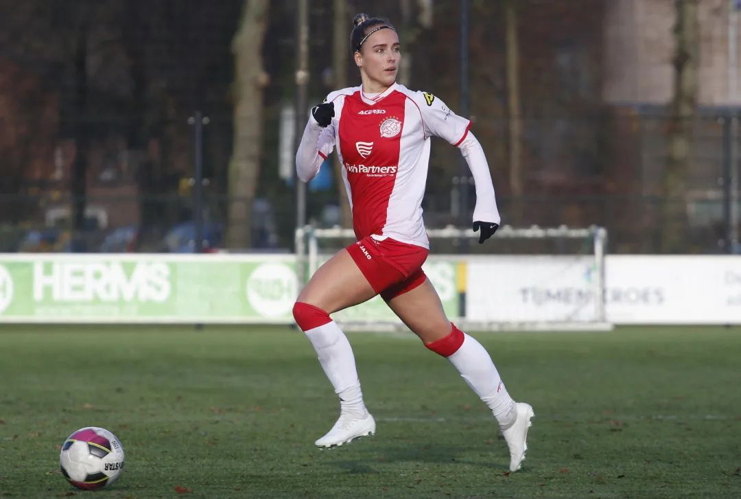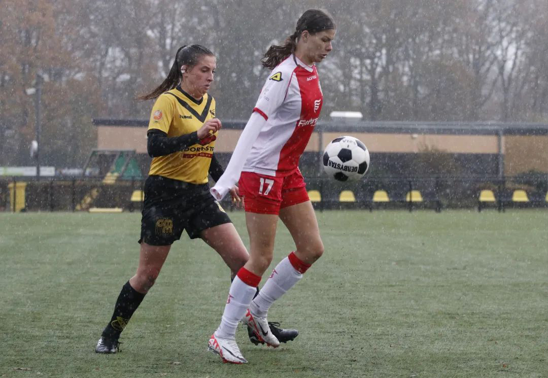 Nadia, die niet te dicht bij de zijlijn kon staan omdat de vlagger te pas en te onpas levensgevaarlijk bleef zwaaien met zijn vlag, werd nog een keer onbestraft aangetikt in de zestien, maar haar wraak was zoet. In de 41e minuut gaf Joyce Hartog een dieptebal op Alice waar iedereen bang van werd. Dit was een halve assist op Nadia die de geweldig teruggelegde bal van Alice bij de tweede paal binnen werkte. Verbazen deed het al niet meer maar de vlag stond alweer fier omhoog, maar scheidsrechter Strijk ging niet mee in dit bedrog en dus 0-1.