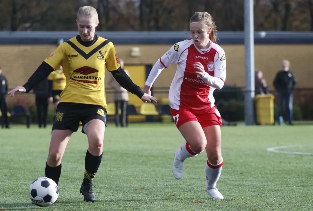 | Shanice van Kampen zit VIOS-aanvoerder Estelle van Wijngeeren op de hielen. |