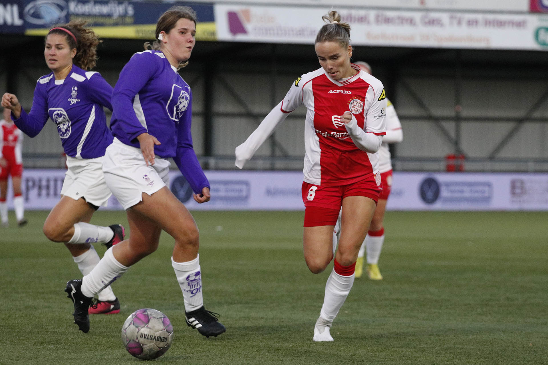De van een hamstringblessure terugkomende Lotte Meester moest helaas na één uitstekende helft uit voorzorg gewisseld worden. Met het inbrengen van Shanice van Kampen werd geprobeerd het grootste gevaar van de Paars Witten verder te neutraliseren. De coach van de studentenclub greep heel stevig in door drie wissels toe te passen. Odysseus kwam dan ook uitstekend uit de startblokken en IJsselmeervogels hield de eerste minuten na rust vooral door een uitstekend keepende Jonne Odding de nul.