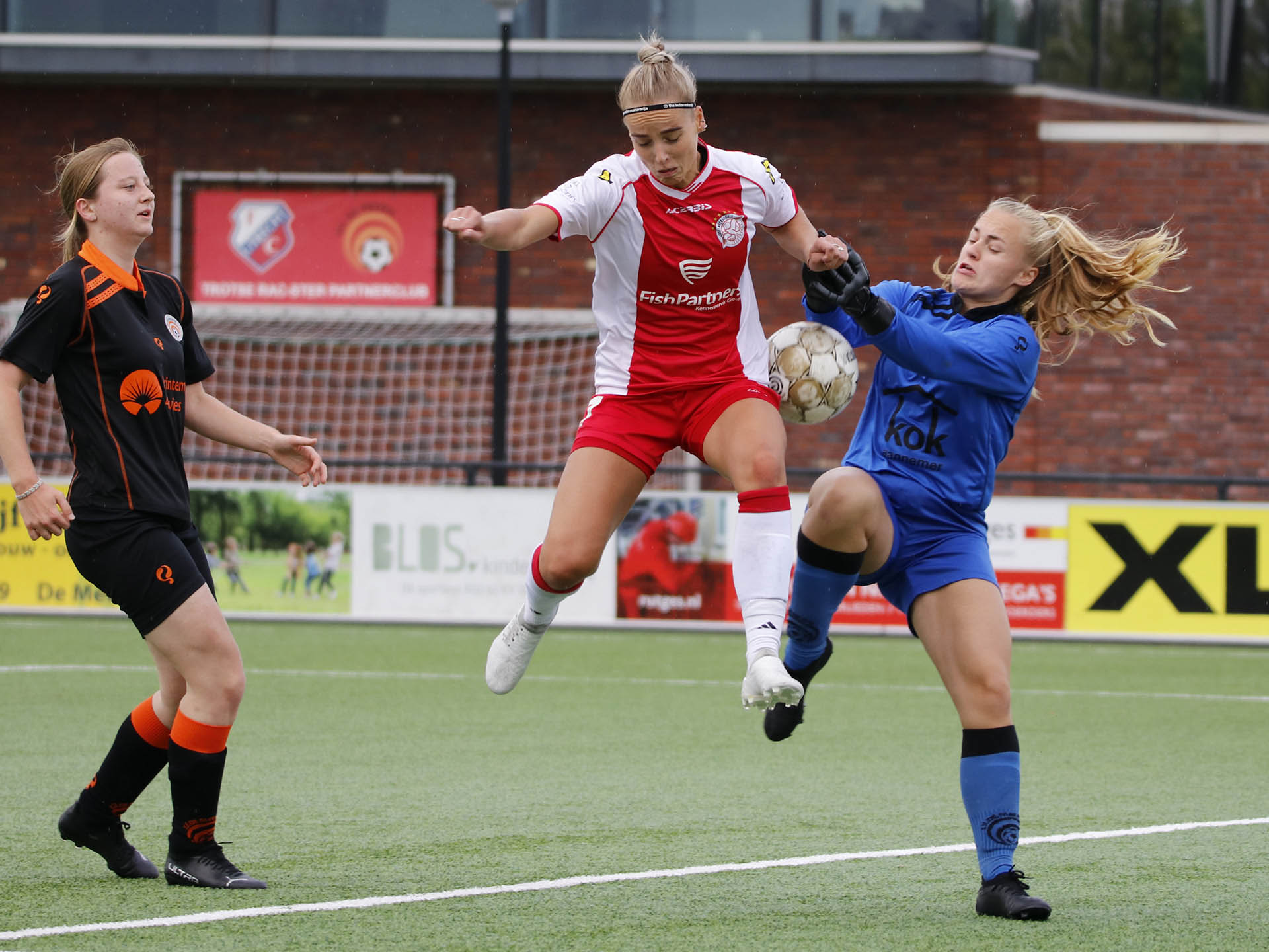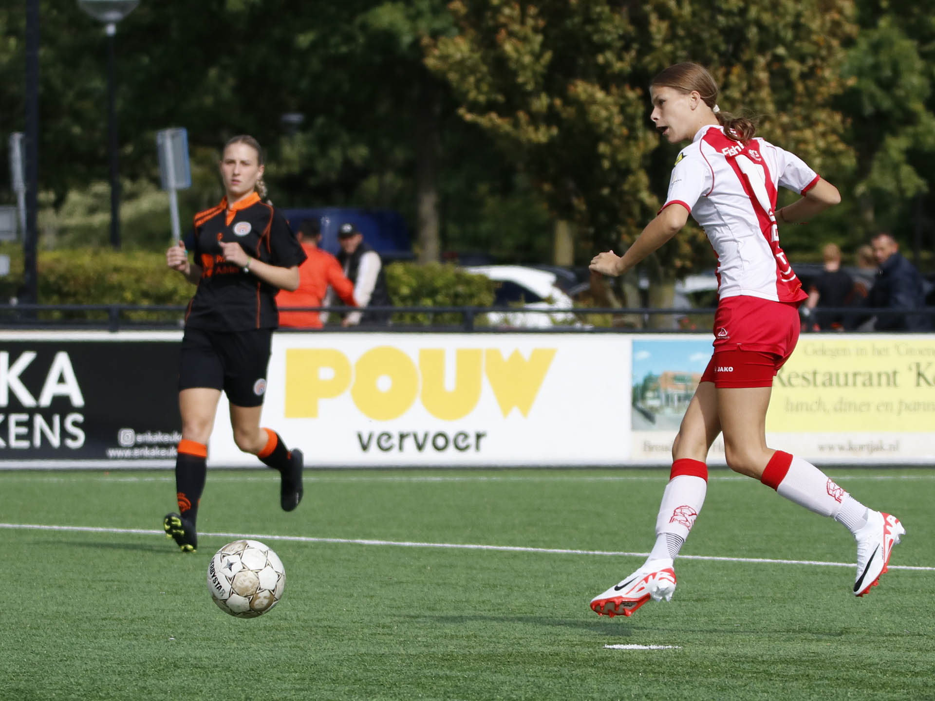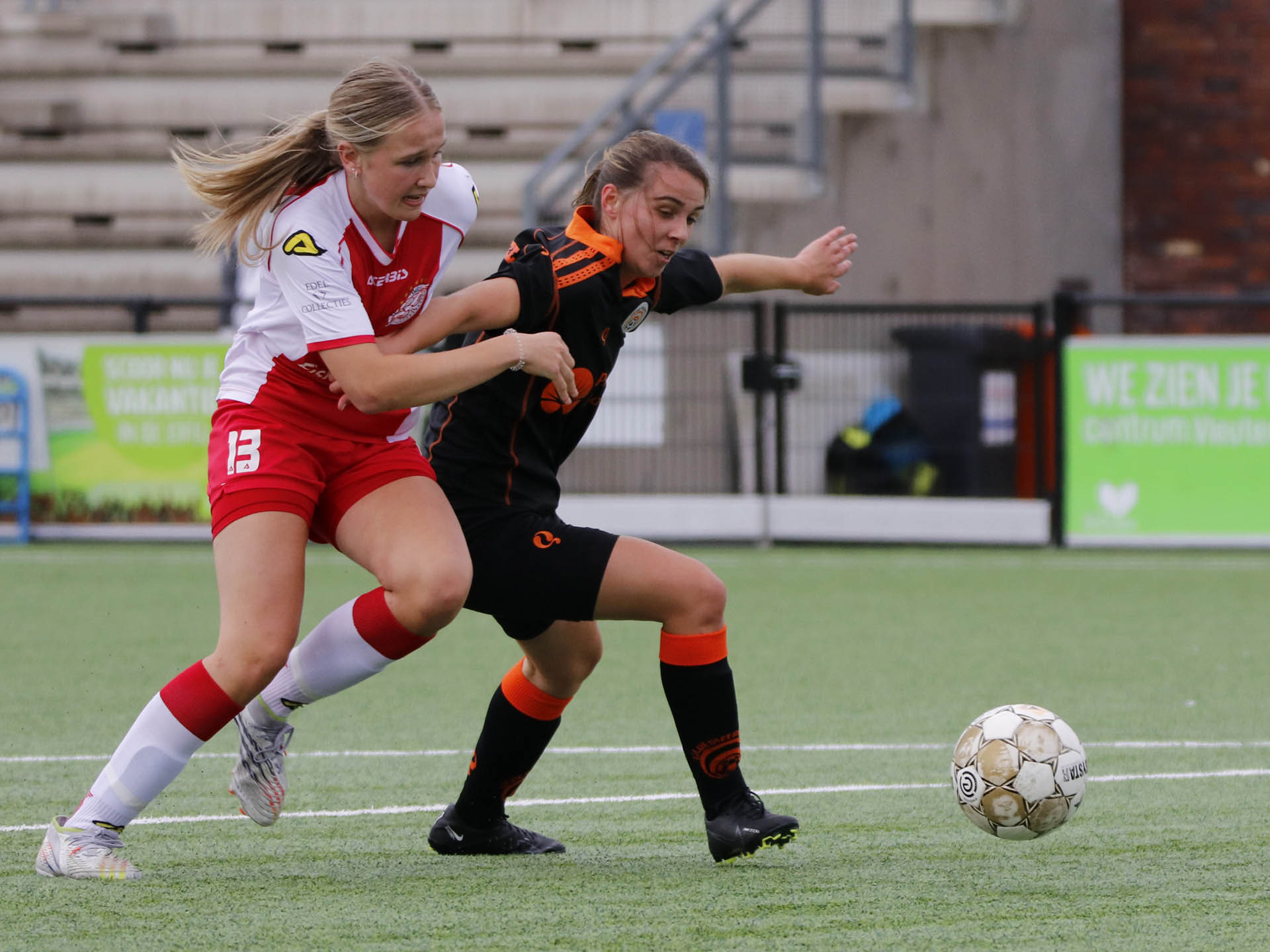 De aanvallende intenties van De Meern waren meteen duidelijk maar in de 3e minuut kwamen de Rooien al op voorsprong. Goed druk zetten in de opbouw leverde Nadia Hartog balbezit op. Na een goede actie bediende zij Sam Koelewijn en die schoot geplaatst de 0-1 binnen.