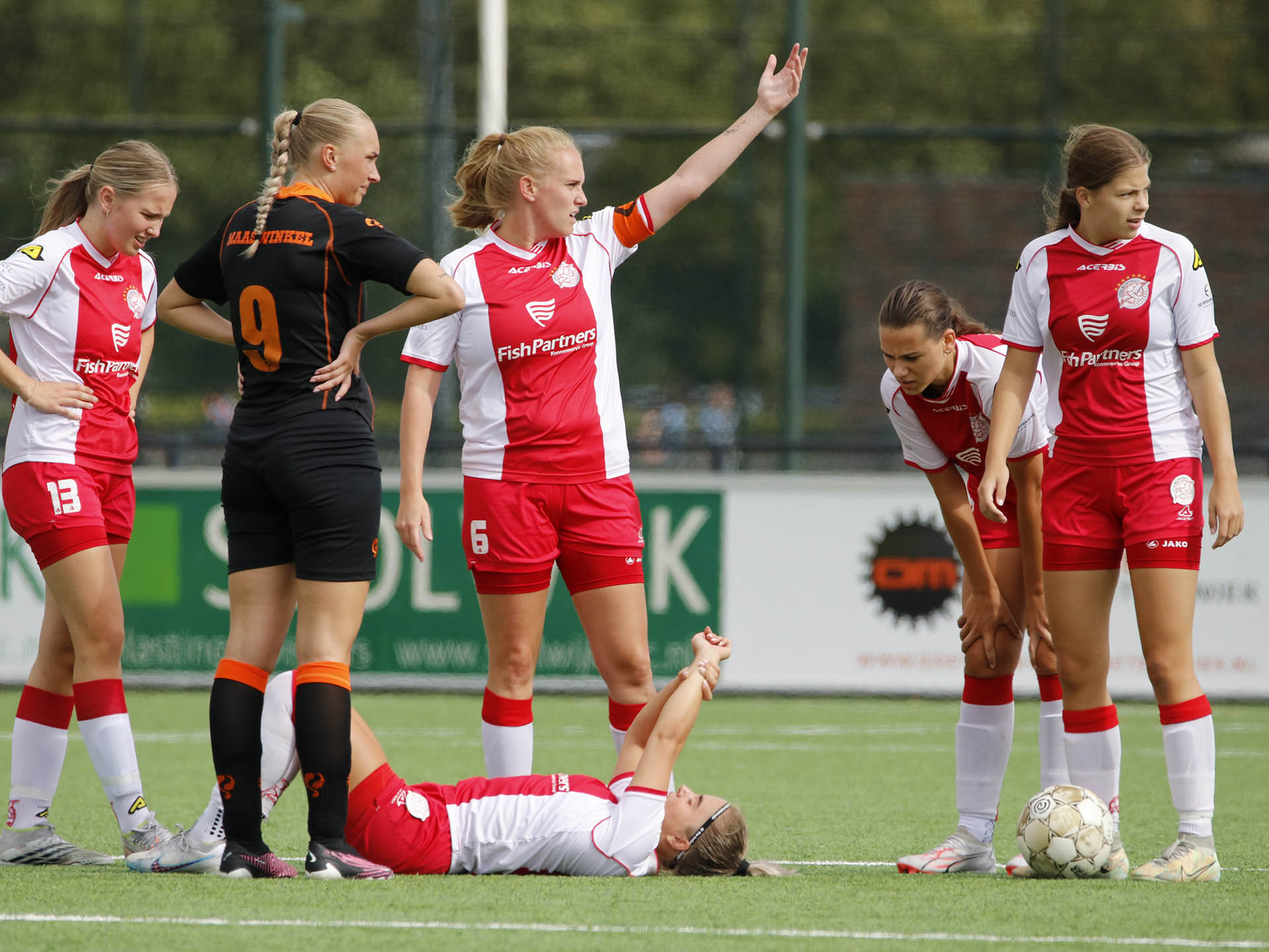 | Lotte Meester is geblesseerd en aanvoerder Angela van de Groep vraagt om verzorging. |