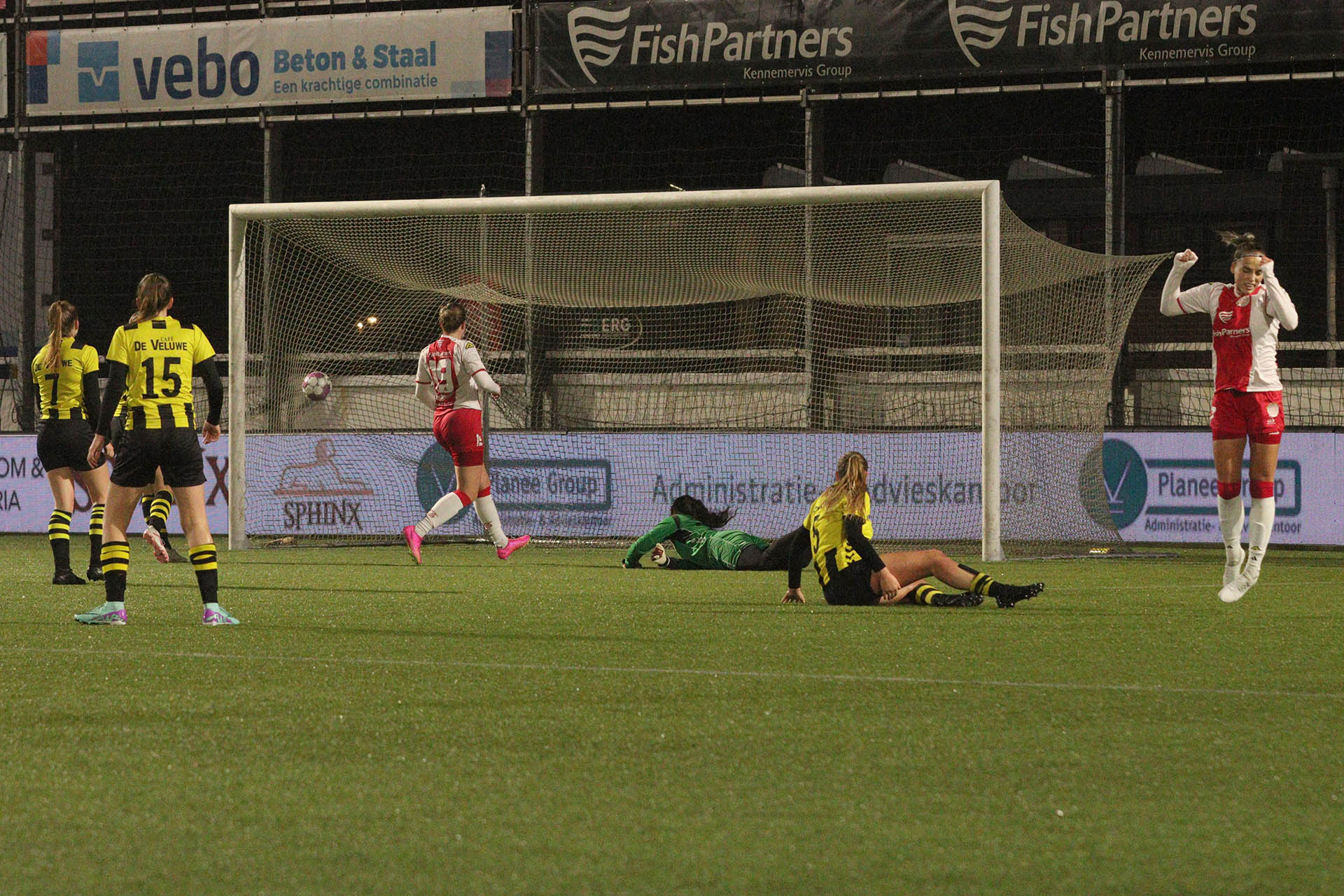 Alice zag nog een schot in de lange hoek goed gepakt worden. Lisa Zwaan kopte de bal uit een corner net over en wederom Alice lobde één op één met de keeper net naast. Het 15-jarige megatalent Esri de Harder schoot een bal op de lat en Emma van Eeken trof nog de paal. Gescoord werd er echter niet meer en nat geregend maar voldaan kon de kleedkamer opgezocht worden. De achterstand op koploper Odysseus is vier punten dus zijn de vrouwen nog vol in de race.