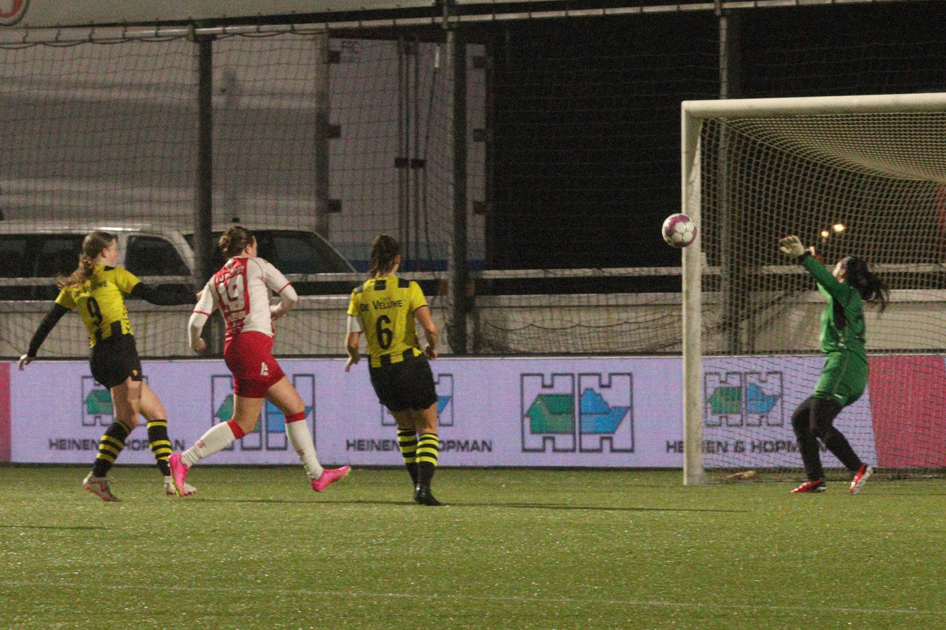 | Alice van Diermen promoveert de voorzet van Nadia Hartog tot doelpunt. |