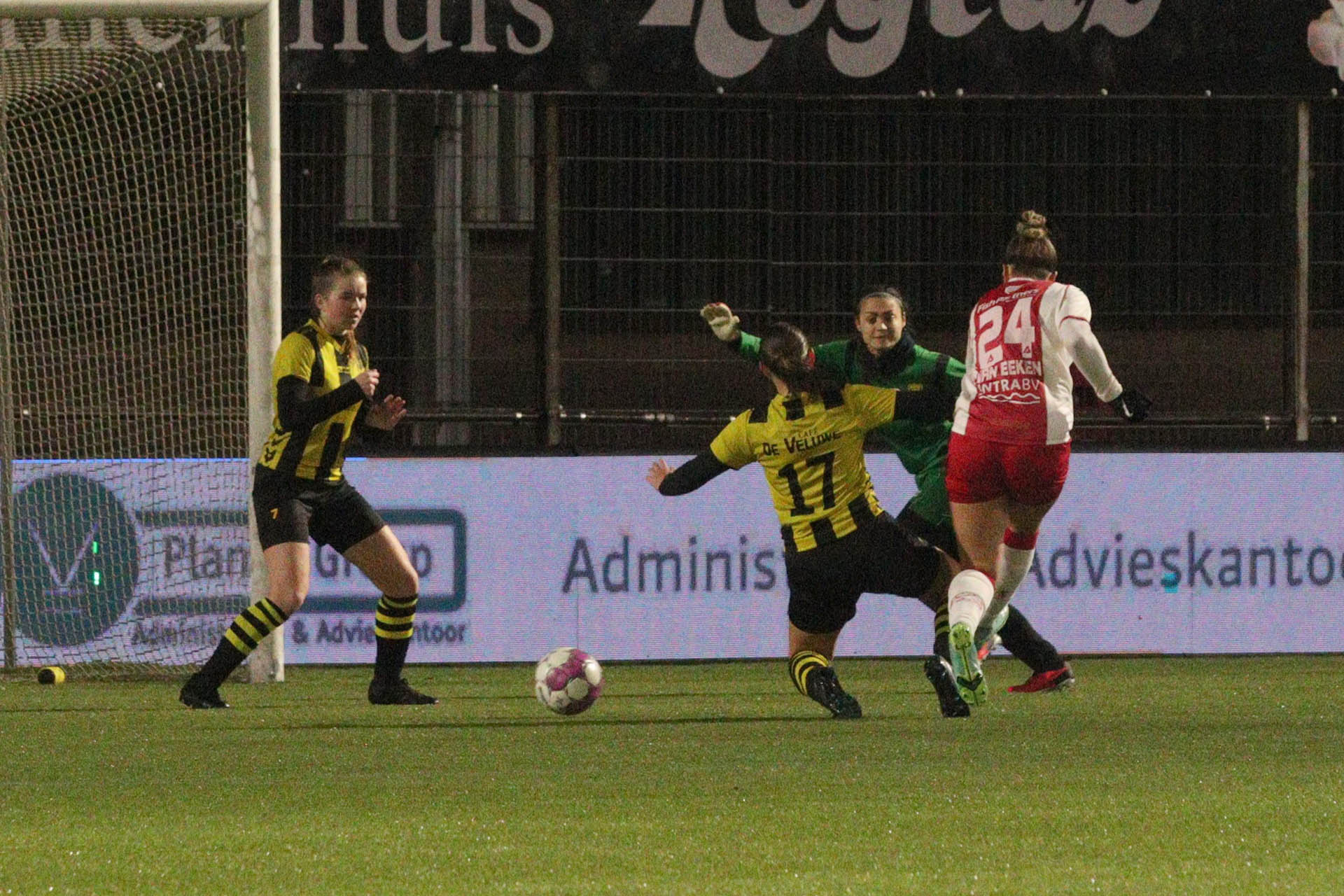 Toch bleven de grote kansen uit. Captain Tessa Koelewijn schoot nog een keer van afstand. Na goed druk zetten van Alice van Diermen schoot DVS de bal bijna in eigen doel. Toen de rust naderde was het Nadia die diep ging en de bal panklaar bij de tweede paal legde waar Alice klaar stond om af te ronden, 2-1. Hierna stonden de gasten uit Ermelo echt op omvallen, want in drie minuten kwam IJsselmeervogels nog twee keer dicht bij de 3-1.