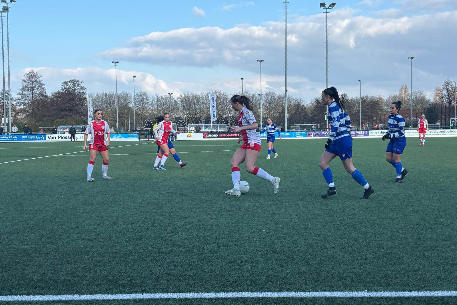 De wedstrijd begon meteen met een gevaarlijke diepe bal op Naomi Vermeer, waar de keeper van de Blauwwitten alert op was. In de derde minuut combineerde Xerxes door de verdediging en was Jonne Odding scherp bij de eerste paal. Even later was het Alice van Diermen die Naomi de ruimte in stuurde, die van linksbuiten de 'zestien' insneed en voorlangs schoot. Xerxes liet zich zien met een afstandsschot op de buitenkant van de paal. Het spel was van twee kanten slordig met veel foute passes.