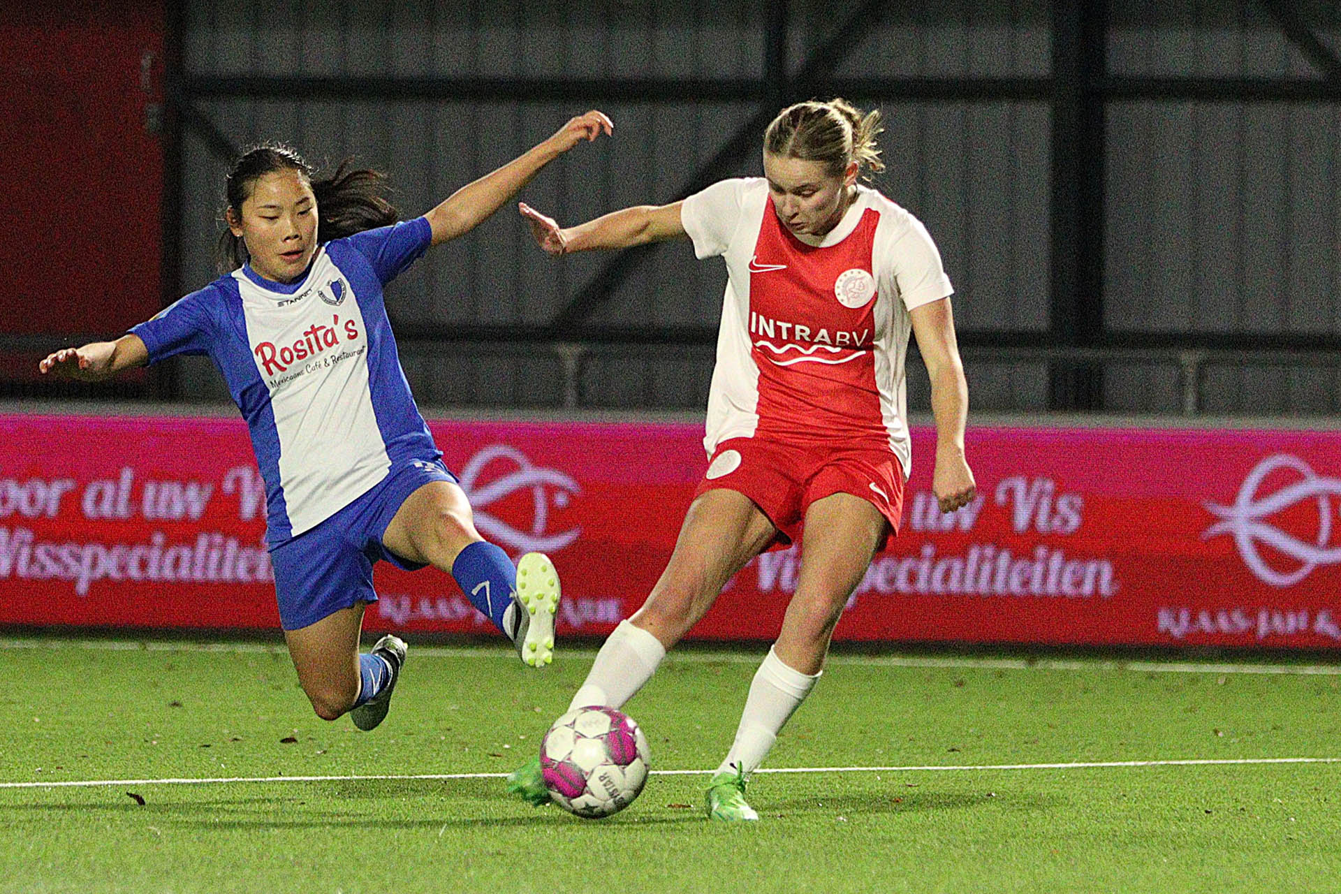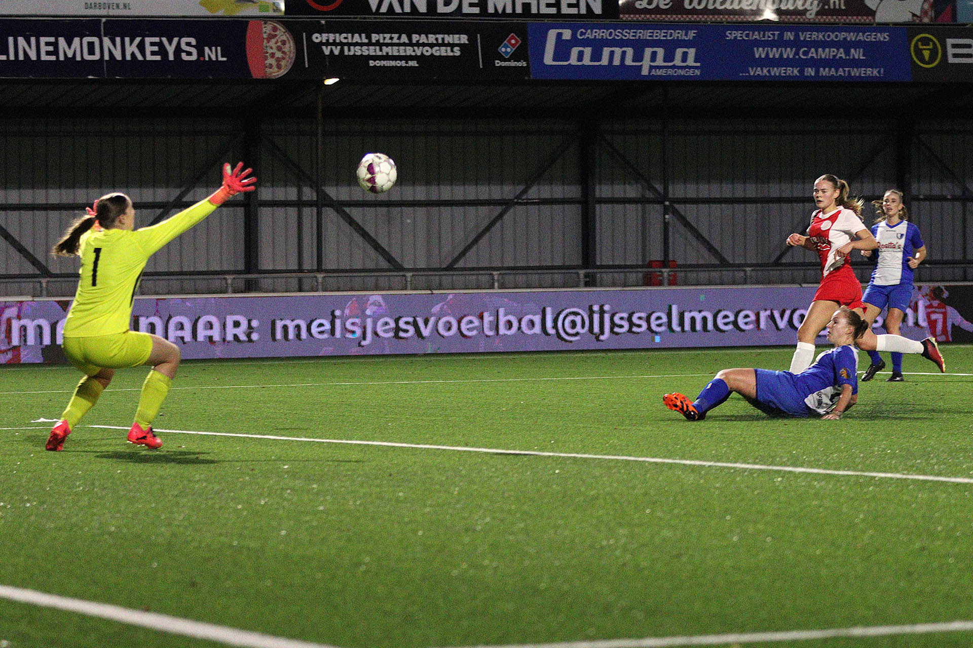 De ploeg uit Almere counterde over de rechter vleugel via Celine Jongejan. Ze dook alleen op voor IJsselmeervogels-keeper Jonne Odding, maar die bracht redding ten koste van een corner.
