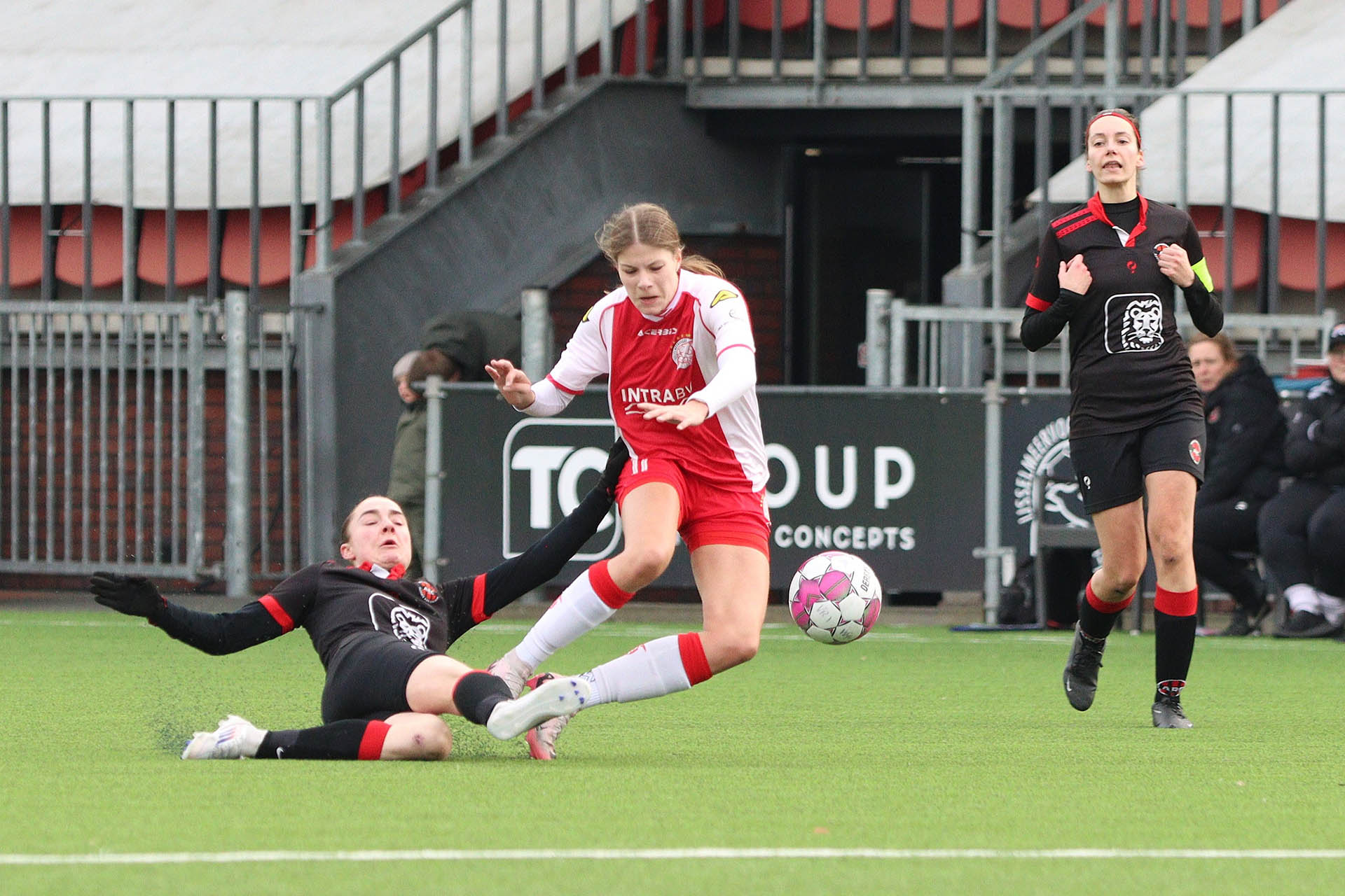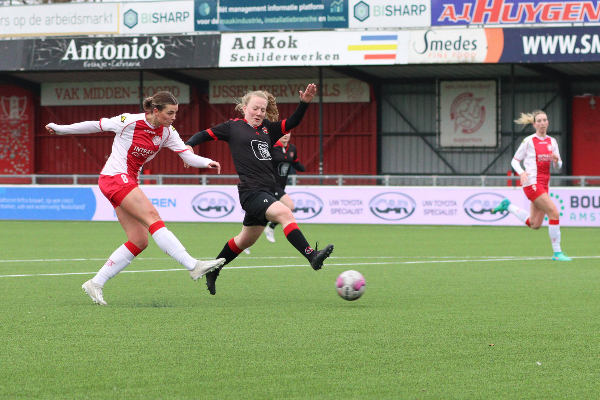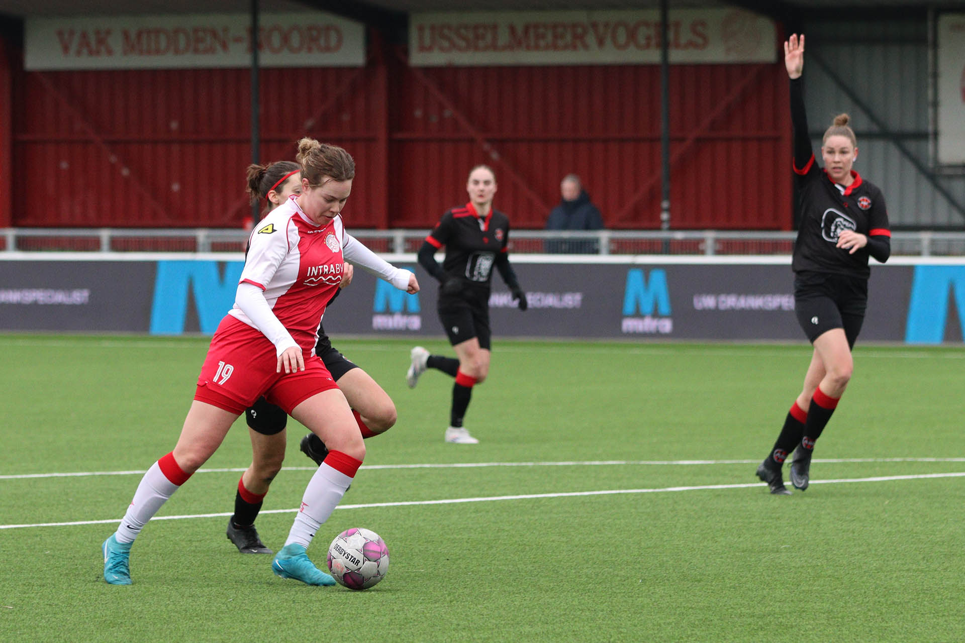 IJsselmeervogels begon goed aan de wedstrijd wat resulteerde in een schot van Lotte van Diermen in de openingsfase. Na een minuut of tien zag je het spel steeds meer verschuiven richting de bezoekers. In de 16e minuut leverde dat een kans op voor ARC na een goede omschakeling. Nog geen minuut later was er een gevaarlijk schot tegen de lat boven Jonne Odding, gevolgd door een fase met weinig kansen met bij vlagen goed combinatievoetbal van de gasten en slordig spel van de thuisclub. Tot de 36e minuut toen Naomi Vermeer een fraaie actie inzette, haar tegenstander passeerde en de bal bij de tweede paal neerlegde waar Alice van Diermen er net niet bij kon.