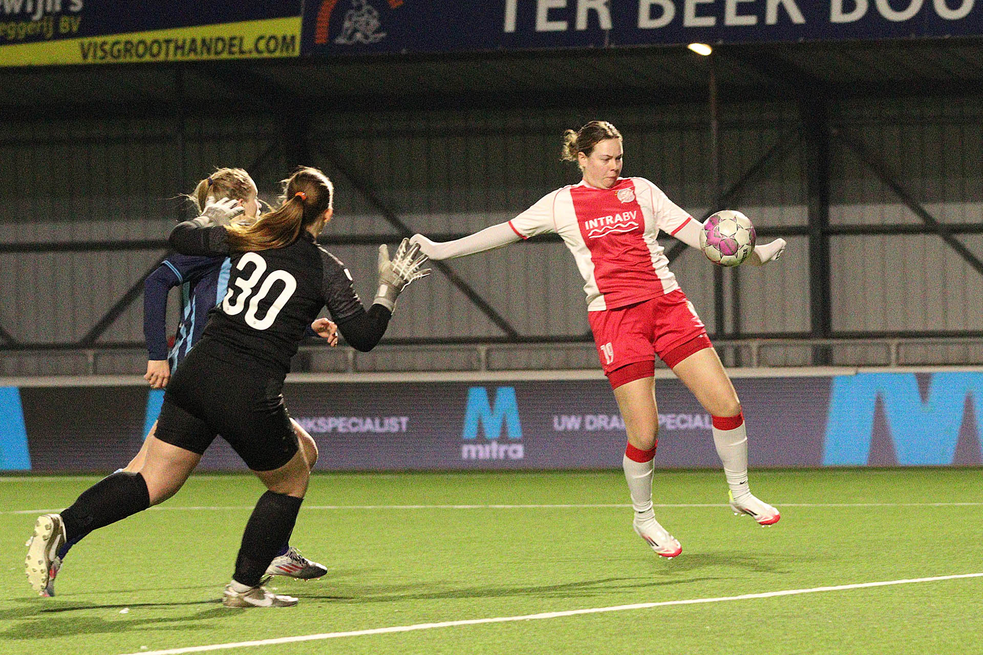 | Emma van Eeken scoort met een bekeken boogbal, maar de gelijkmaker wordt na een vlagsignaal afgekeurd. |